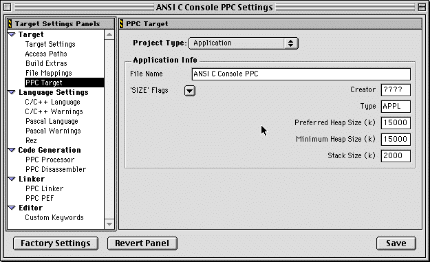 Une autre solution moins portable (et donc moins conseillée) est de modifier les préférences de compilation (68K Compiler settings) de manière à tourner ON : (dans ce cas il faudra aussi souvent augmenter le tas, mais pas la pile car pas de paramétrage de la stack sous 68K Compiler settings).