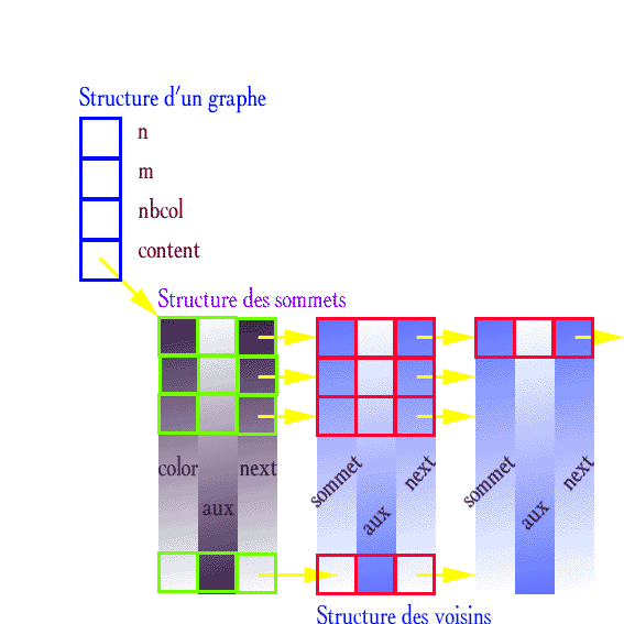 D'autre part pour certains algorithmes cette structure peut paraître trop complexe. Par exemple dans le cas où le nombre des voisins de tous les sommets reste invariants. Dans un pareil cas la liste dynamique horyzontale est mal adaptée car plus délicate à manipuler qu'un vecteur (alloué dynamique par bloc: (int *) malloc (taille *sizeof(int))) par exemple.